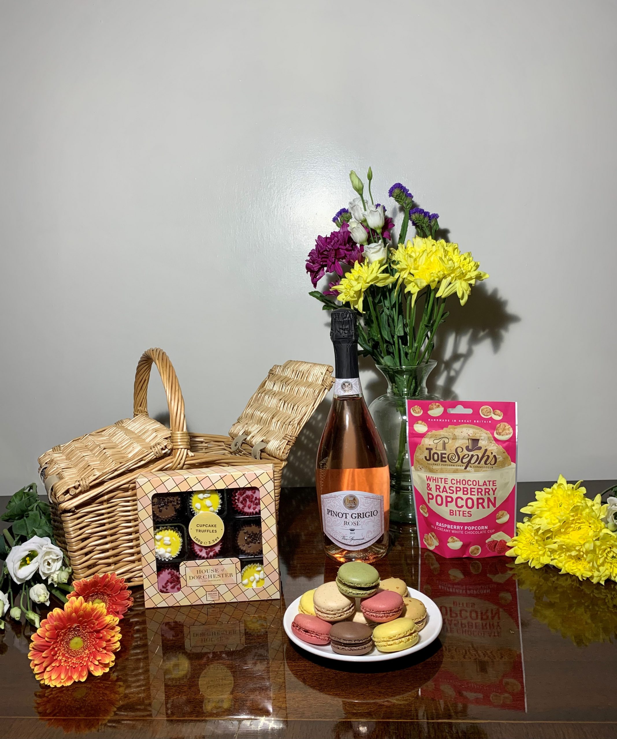 This sparkling celebration hamper is a scrumptious gift for any occasion. Contents: 1 x Double-sided Wicker Hamper Basket 1 x 70cl Sparkling Rose Wine 1 x 115g House of Dorchester Cupcake Truffles 1 x 63g Joe & Seph’s White Chocolate and Raspberry Popcorn 1 x 144g Les Delices de Rose Macaron Collection
